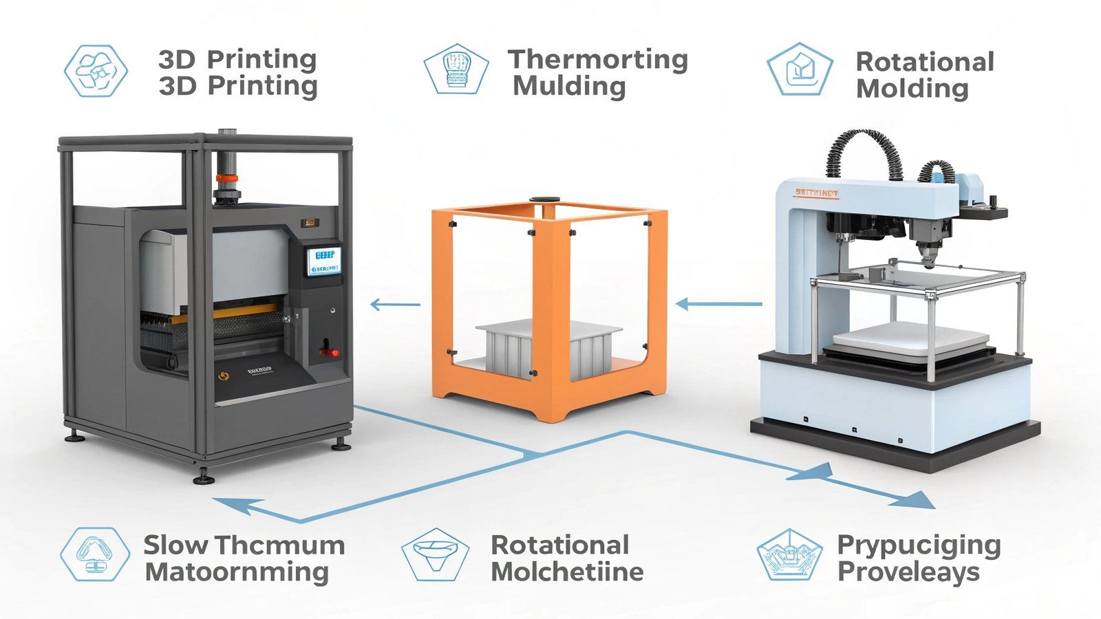 Processes like 3D printing, thermoforming, and rotational molding can be cheaper for small runs or prototypes, but injection molding is cost-effective for large-scale production.